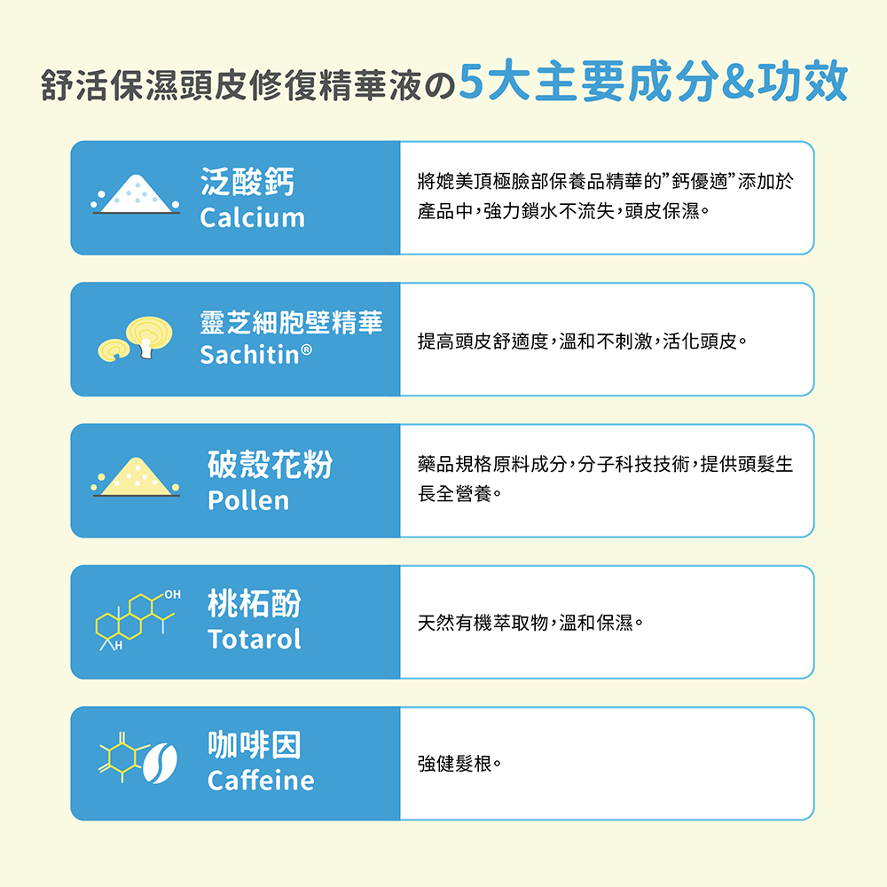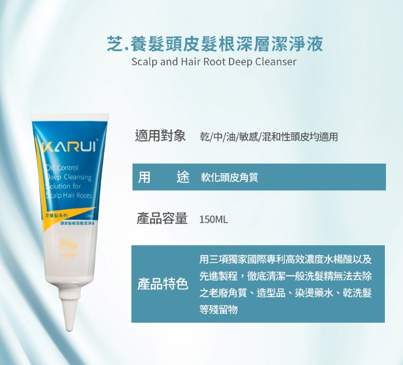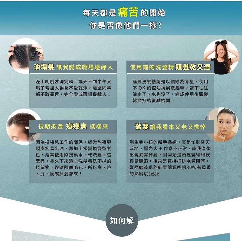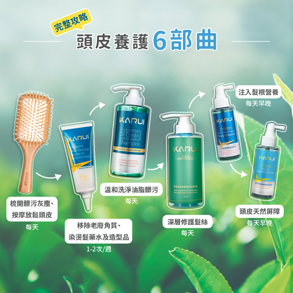 用梳子按摩頭皮→去角質淨化液→洗髮精→養髮精華液→修復液