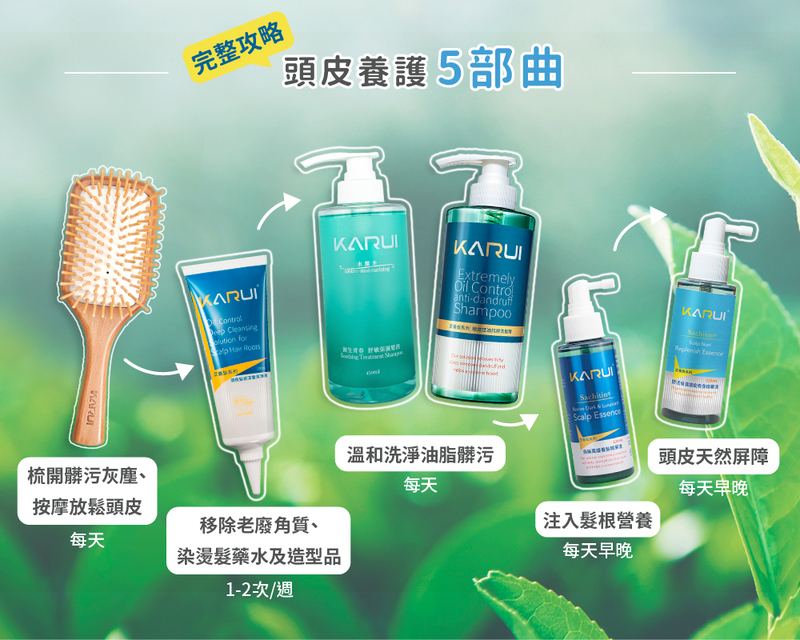 用梳子按摩頭皮→去角質淨化液→洗髮精→養髮精華液→修復液