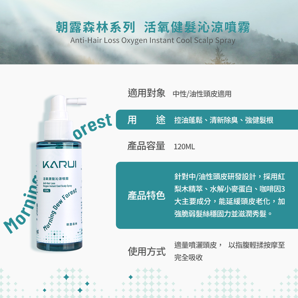 組合包括:<外出>朝露森林 健髮控油沁涼噴霧120ml大容量 × 1+<居家>芝養髮 烏絲萬縷養髮精華液120ml大容量 × 1